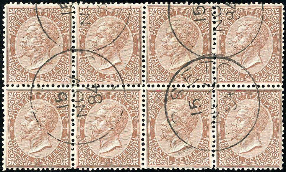 1863 - 30 cent. De La Rue, tiratura di Torino (T19), blocco di otto esemplari usati, perfetto. Raro. Emilio ed A. Diena, cert. Raybaudi.