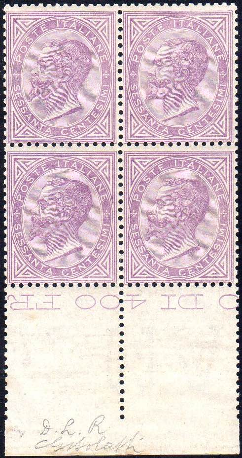 1863 - 60 cent. De La Rue, tiratura di Londra (L21), discreta centratura, blocco di quattro, bordo di foglio, gomma integra, perfetto. Molto fresco. G.Bolaffi, A.Diena.
