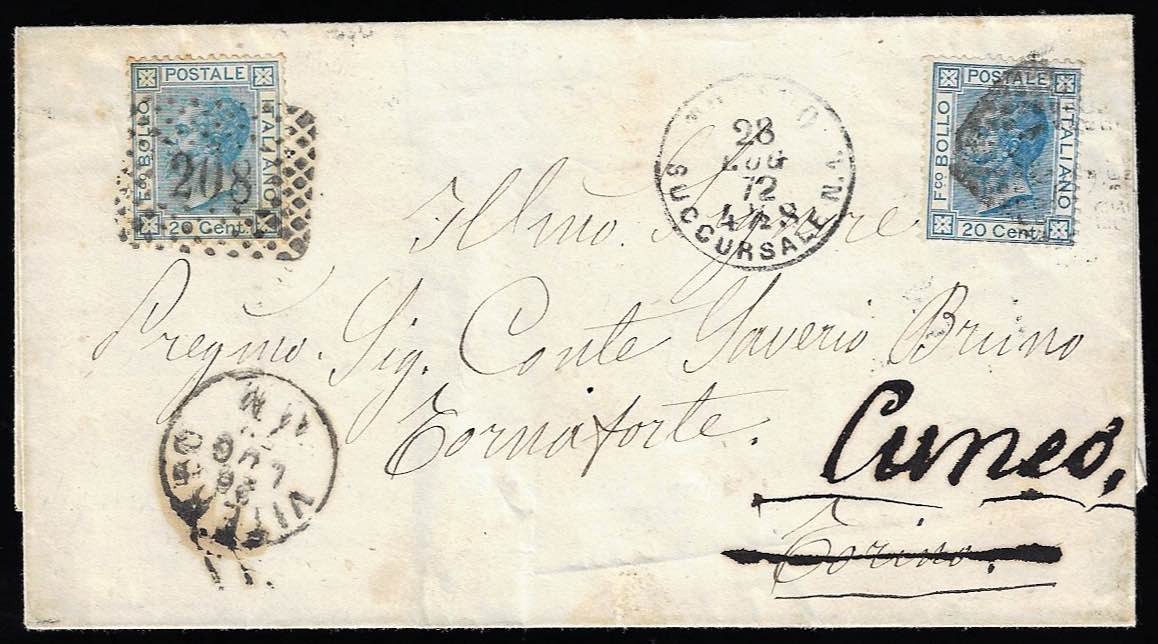 1872 - 20 cent. azzurro, tiratura di Torino (T26), perfetto, su sovracoperta di lettera da Viterbo 26/7/1872 a Torino, rispedita a Cuneo dopo essere stata riaffrancata con un altro 20 cent. (T26), di tinta diversa. Interessante!
