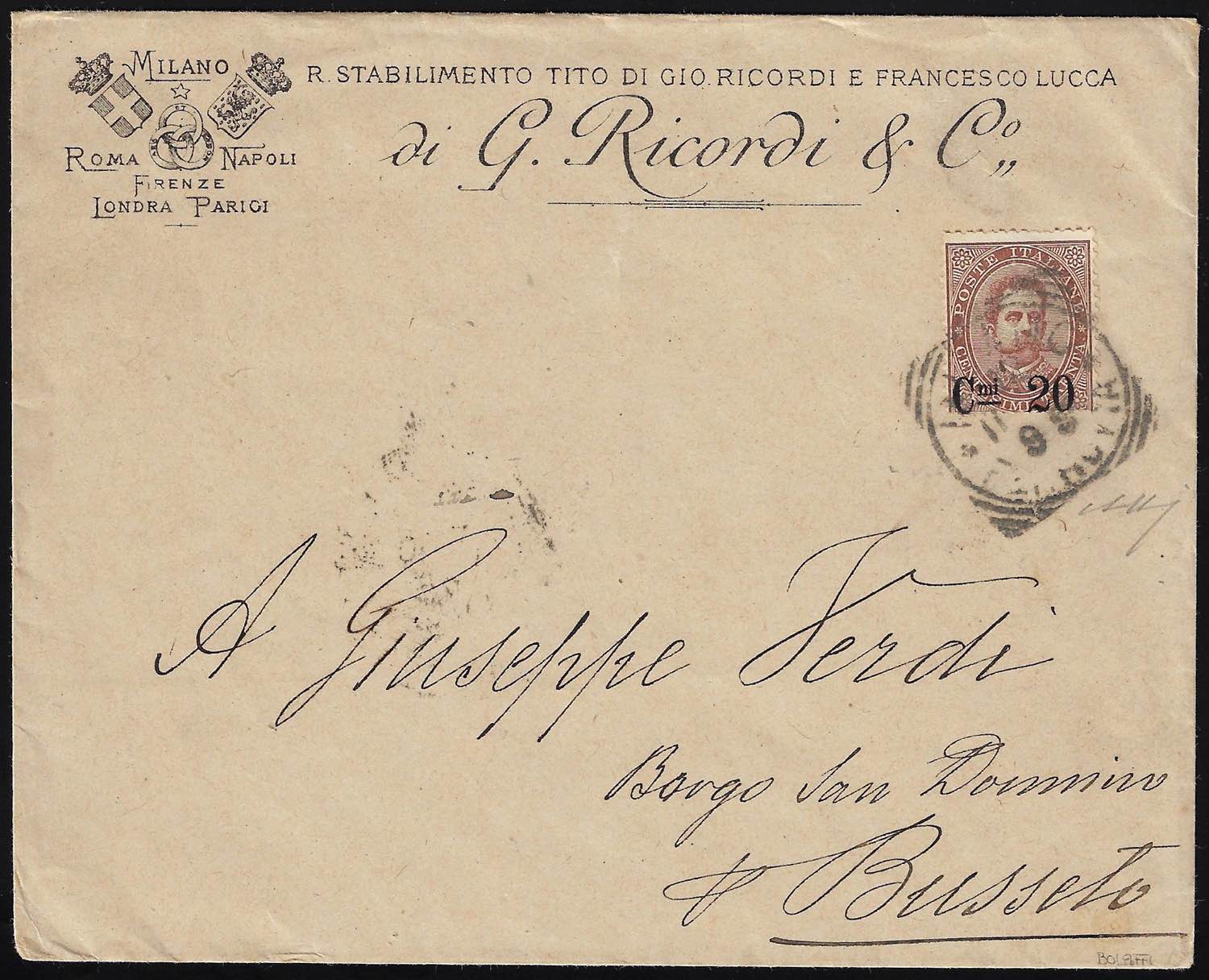 1890 - 20 cent. su 30 cent. Umberto I (57), perfetto, su busta intestata della ditta Ricordi di Milano 11/11/1890 a Busseto, indirizzata a GIUSEPPE VERDI. Interessante. A.Bolaffi.