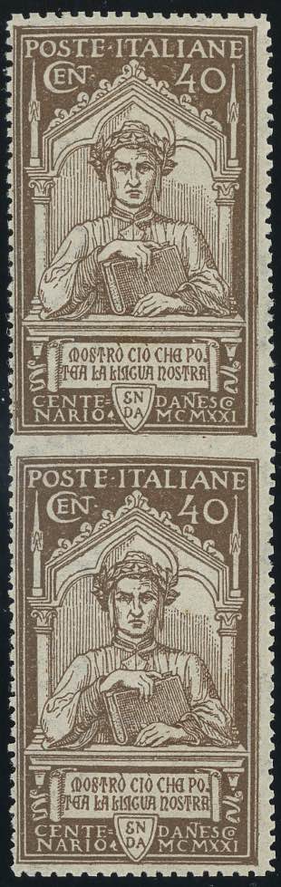 1921 - 40 cent. Dante, coppia verticale non dentellata al centro (118), gomma originale, integra per l'esemplare inferiore, perfetta. Bella ... Read more