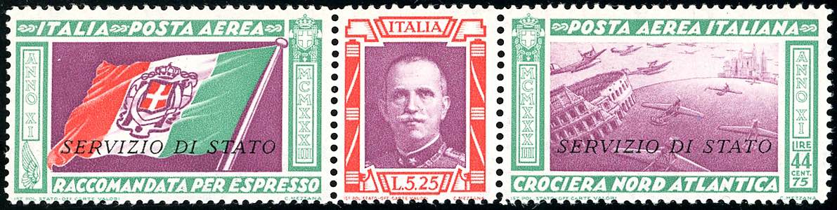 1933 - 5,25 + 44,75 lire trittico Servizio di Stato (1), buona centratura, gomma integra, perfetto. Cert. G. Bolaffi, Ferrario, Pizzigoni.