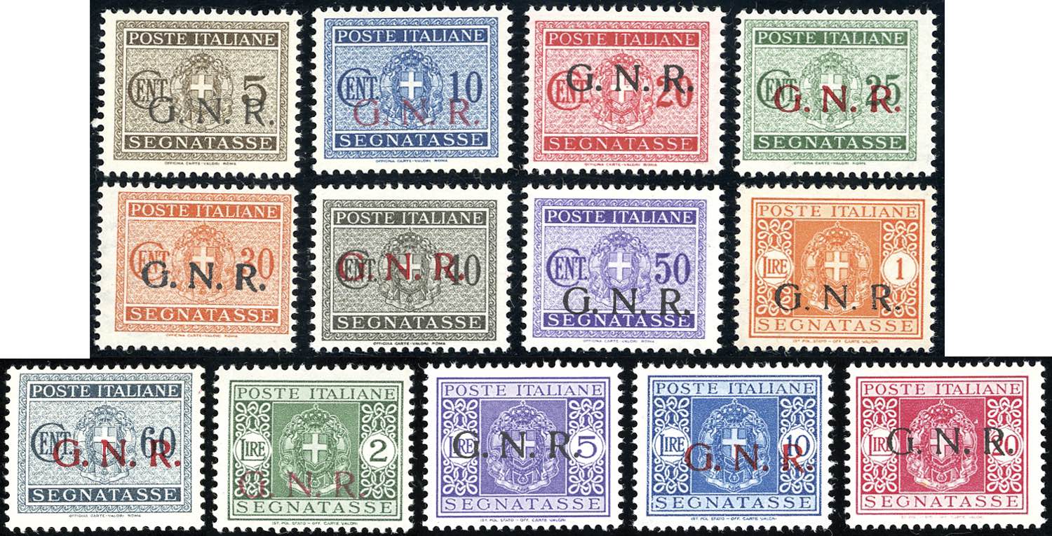 1944 - Soprastampati G.N.R., tiratura di Verona (47/59), gomma integra, perfetti. Ottima qualità. G.Oliva per gli alti valori e cert. Ferrario.