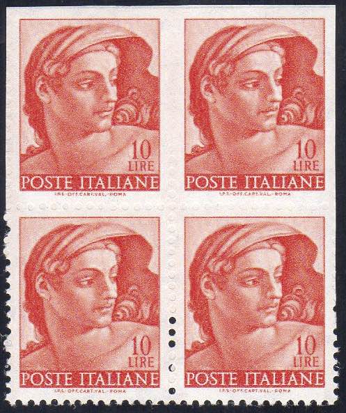 1961 - 10 lire Michelangiolesca, blocco di quattro con i due esemplari superiori non dentellati o con dentellatura cieca (901+901d), gomma ... Read more