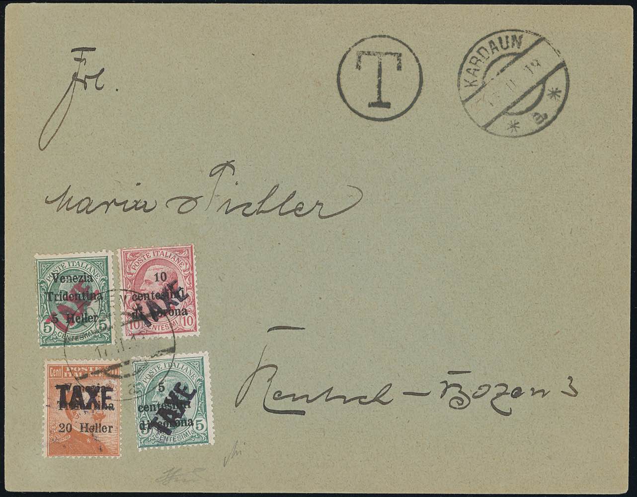 TRENTINO ALTO ADIGE - BOLZANO 3 1919 - Bell'affrancatura quadricolore (BZ3/32,47,51,52), perfetti, su busta non affrancata da Kardaun a ... Read more