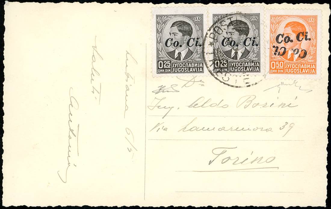 LUBIANA 1941 - 50 p. soprastampato a mano "Co.Ci." in nero, doppia soprastampa di cui una capovolta, entrambe oblique, 25 p. soprastampa a macchina, coppia (2B,1), perfetti, su cartolina da Postumia 8/5/1941 a Torino. Bella varietà non catalogata, UNICA NOTA! Ferrario, cert. Chiavarello.