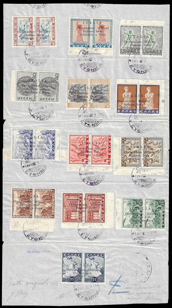 EMISSIONI DI ARGOSTOLI 1941 - Mitologica, 13 valori (11/23), diversi bordo/angolo di foglio, perfetti, usati su un foglio. Insieme bello e raro. A.Diena, Raybaudi, G.Oliva, cert. Ferrario.