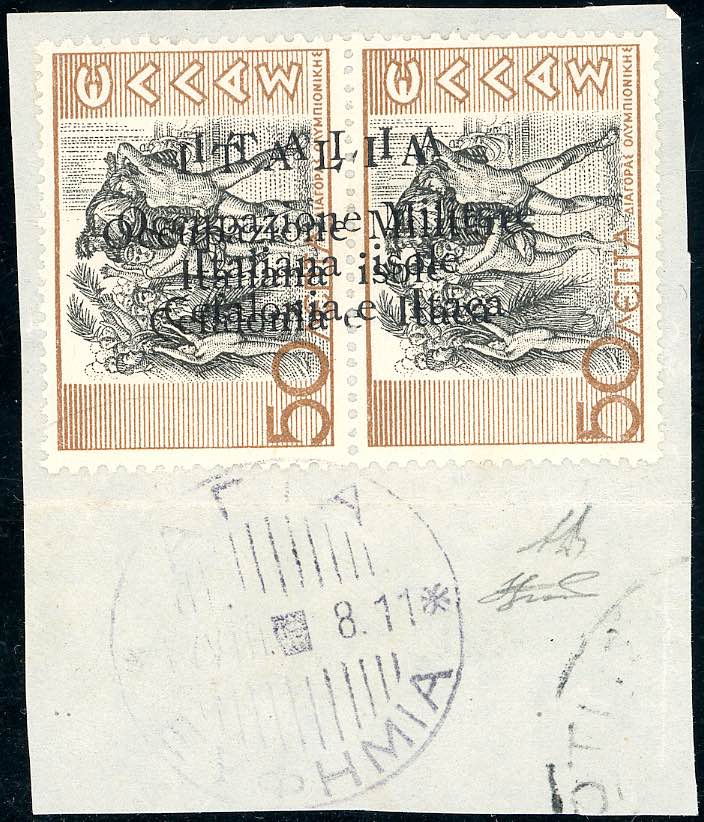 EMISSIONI DI ARGOSTOLI 1941 - 50 l. + 50 l. Mitologica, doppia soprastampa (15f), perfetto, usato su frammento. A.Diena, Ferrario.