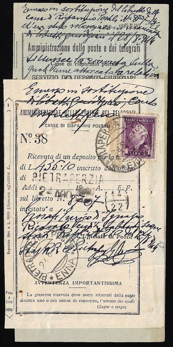 OCCUPAZIONE AMERICANA AMGOT SICILIA 1944 - Ricevuta d'emergenza "in assenza di moduli per libretti giudiziari", con marca da bollo da 2 lire, usata a Pietraperzia 24/8/1944. Allegata la ricevuta definitiva del 13/1/1945. Insieme raro!