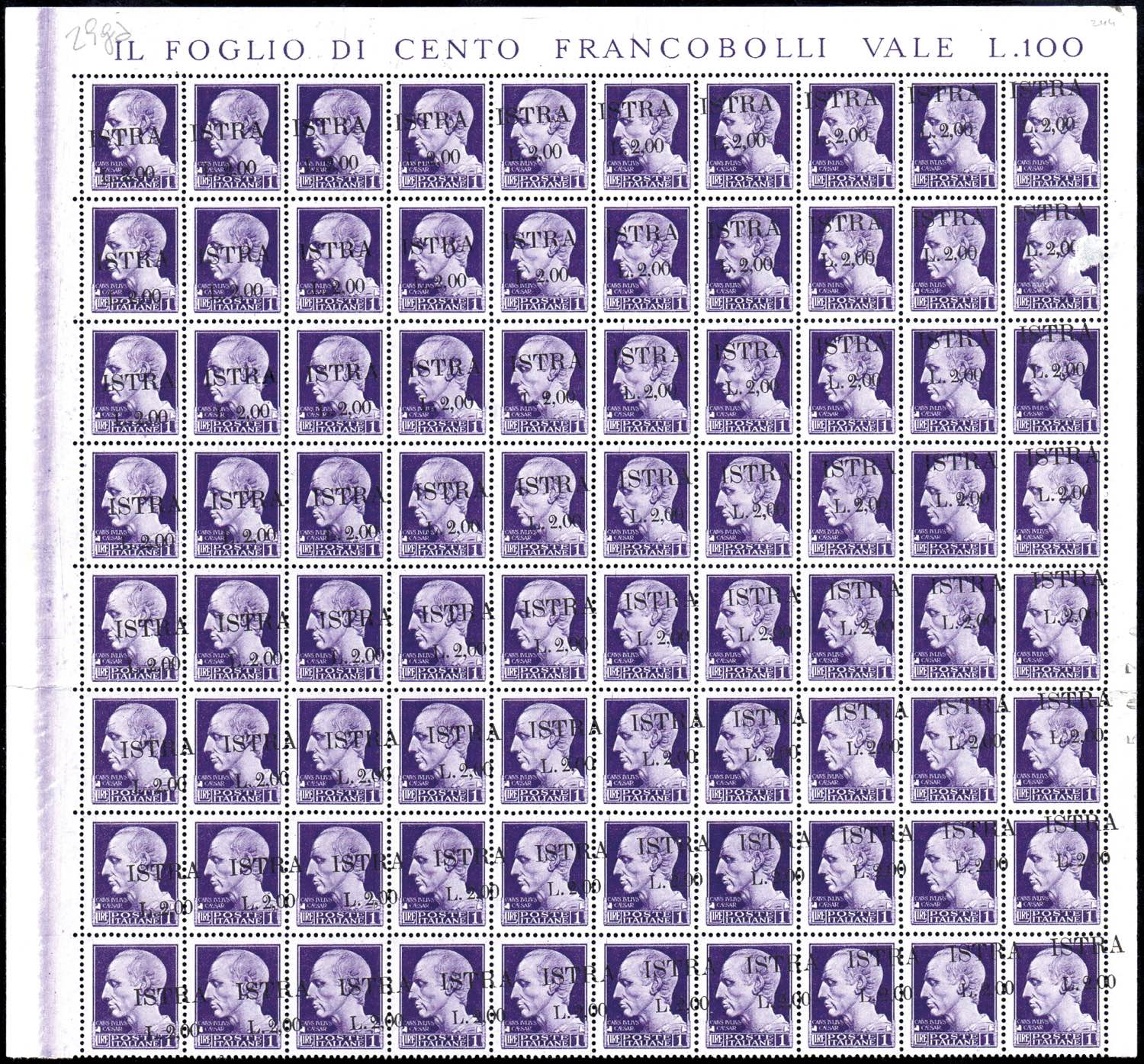 OCCUPAZIONE JUGOSLAVA ISTRIA 1945 - 2 lire su 1 lira, soprastampa obliqua (29ga), blocco di 80 esemplari, gomma integra, un esemplare con abrasione sul fronte, gli altri perfetti. Raro.