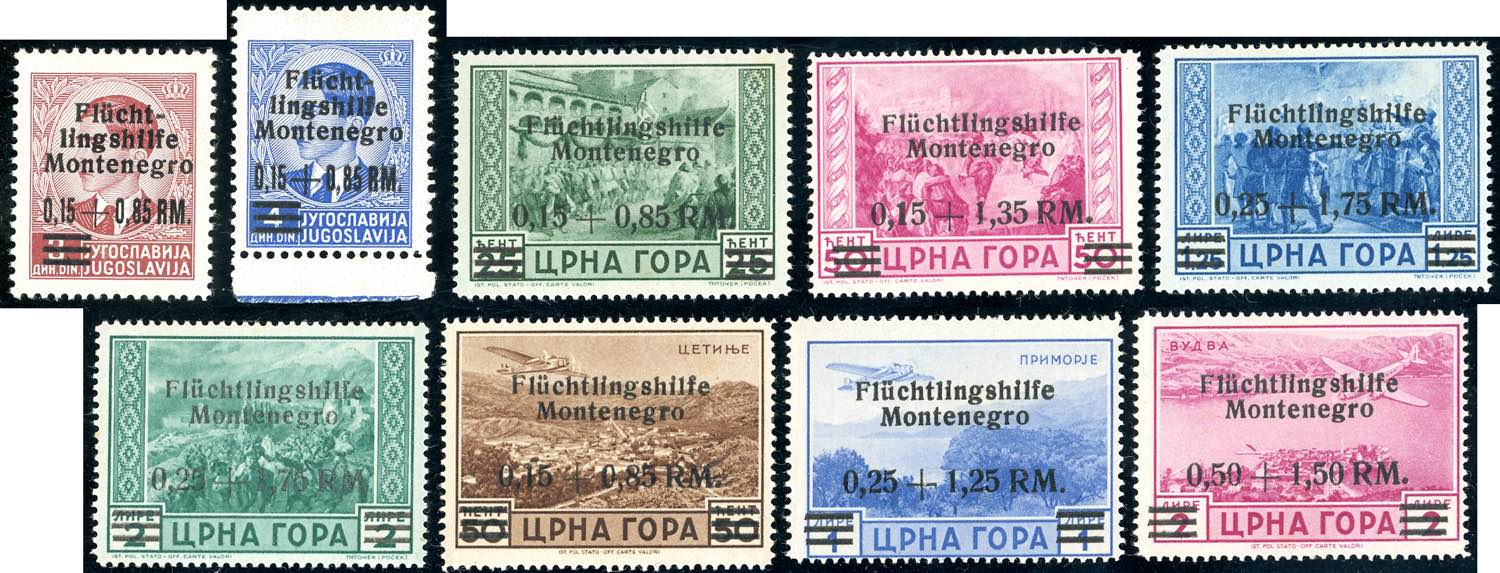 OCCUPAZIONE TEDESCA MONTENEGRO 1944 - Soprastampati Assistenza ai profughi (15/20+A), gomma integra, perfetti, lievi ossidazioni su alcuni valori.