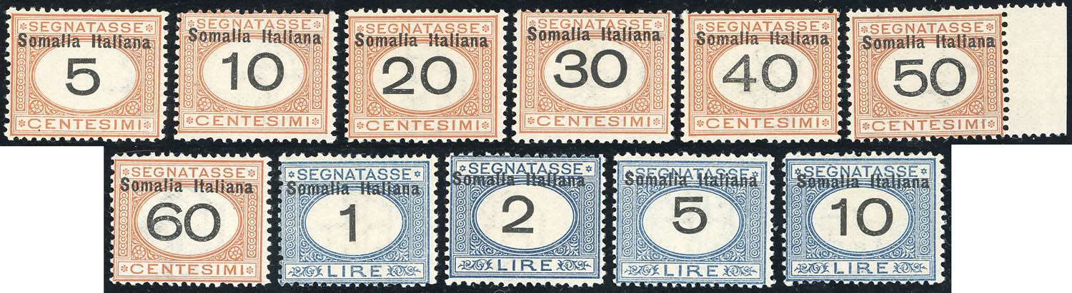 SEGNATASSE 1926 - Cifre nere in moneta italiana (41/51), gomma integra, perfetti. Ottima qualità. Bottacchi per gli alti valori.