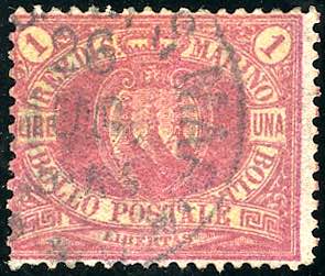 Lot 1529 - 1892 - 1 lira carminio su giallo Stemma (20), usato, ...