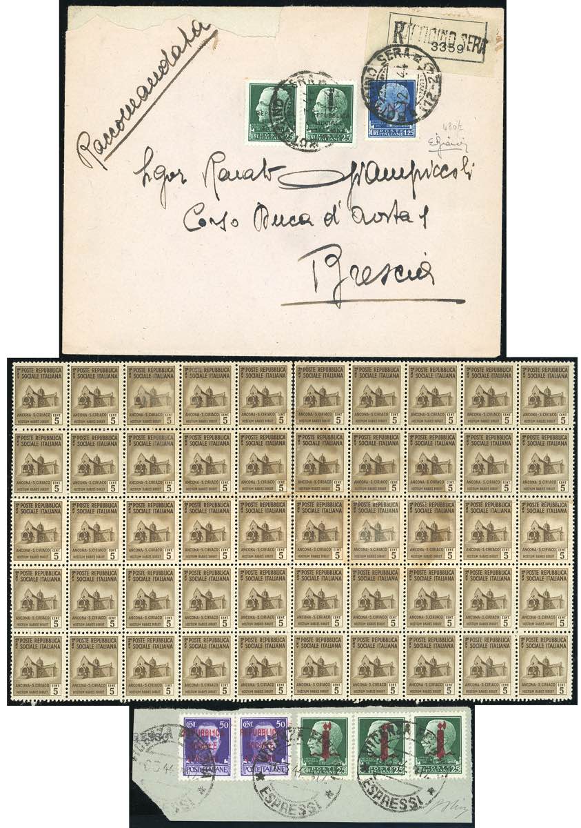 REPUBBLICA SOCIALE ITALIANA 1940 - Insieme composto da 5 cent. Monumenti distrutti, blocco di 50 esemplari con le due file centrali di 20 esemplari stampate su carta ricongiunta (502c), gomma integra, perfetto; 25 cent. Imperiale su carta ricongiunta (502c), gomma integra, perfetto; 25 cent. Imperiale soprastampato fascio in rosso, tre esemplari usati su frammento con complementari, perfetti; 1,25 lire soprastampato G.N.R., tiratura di Brescia, I tipo (480/I), con complementari, su busta raccomandata da Botticino Sera 12/3/1944 a Brescia, cert. Bianchi. Insieme molto raro, occasione.