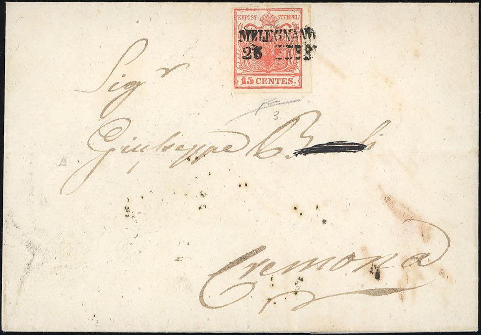 MELEGNANO, SD punti 12 - 15 cent. (3), giusto in un punto a sinistra, su sovracoperta di lettera del 25/2/1851 per Cremona. Molto fresca. R.Diena.