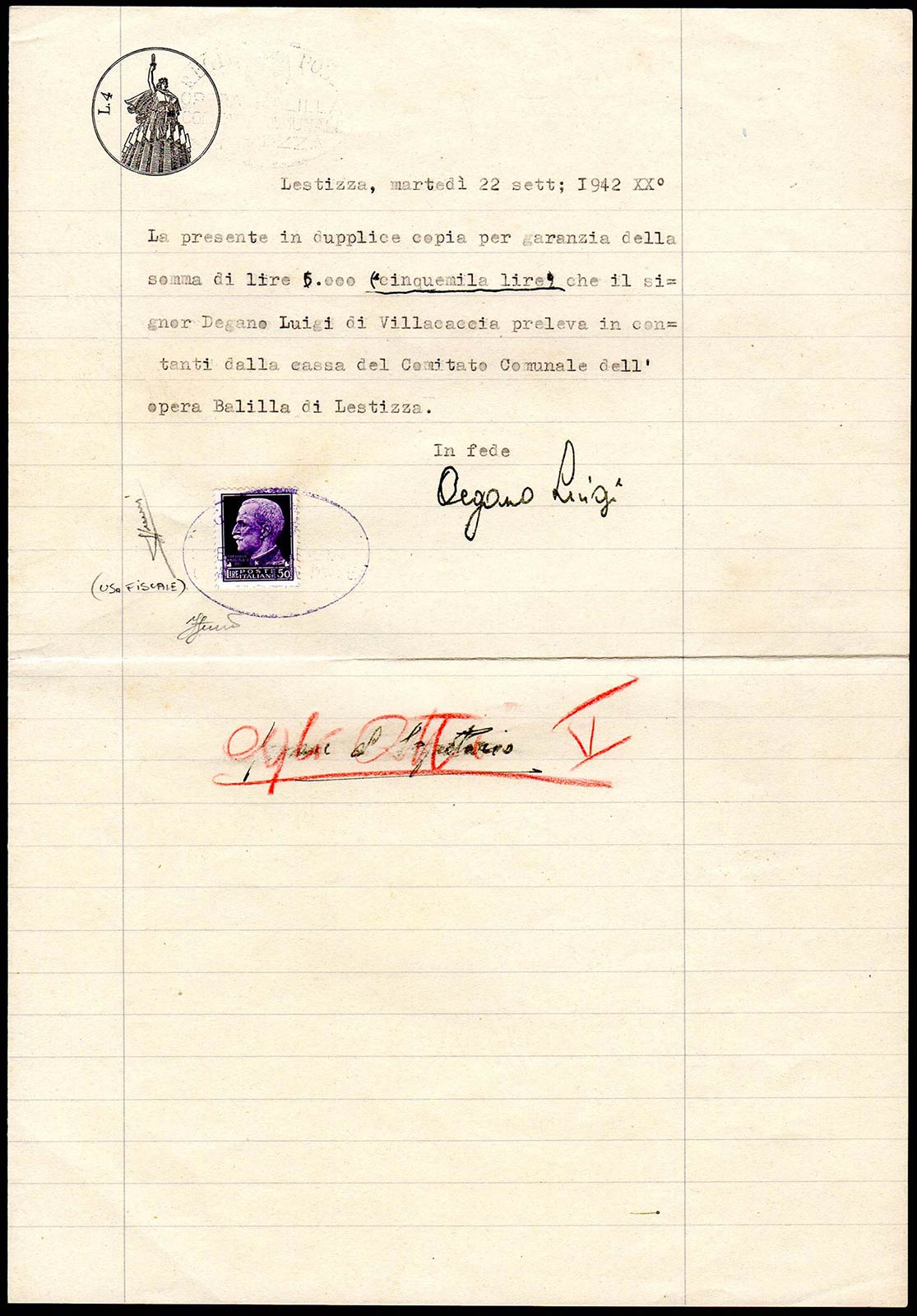 1942 - 50 lire Imperiale (261), perfetto, isolato in uso fiscale su documento dattiloscritto su carta da bollo datata 22/9/1942. Probabilmente unico noto. Cert. Sorani.