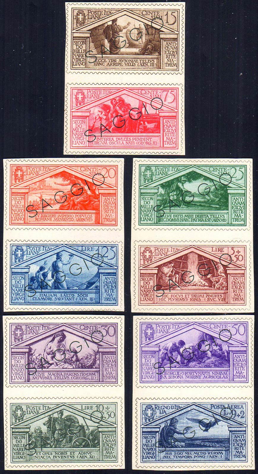 1930 - Virgilio, dieci valori (282/290+A24), stampati su cartoncino, non dentellati, con dicitura "saggio", provenienti da opuscolo informativo distribuito negli uffici postali all'epoca dell'emissione.