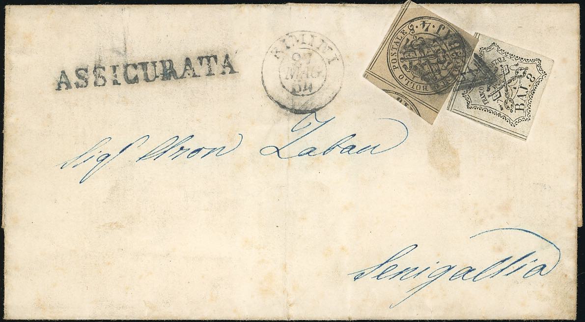 1854 - 4 baj bruno rosaceo chiaro, leggermente intaccato a sinistra, 8 baj bianco, perfetto (5a,9), su sovracoperta di lettera assicurata di doppio porto da Rimini 27/5/1854 a Senigallia. Non comune.
