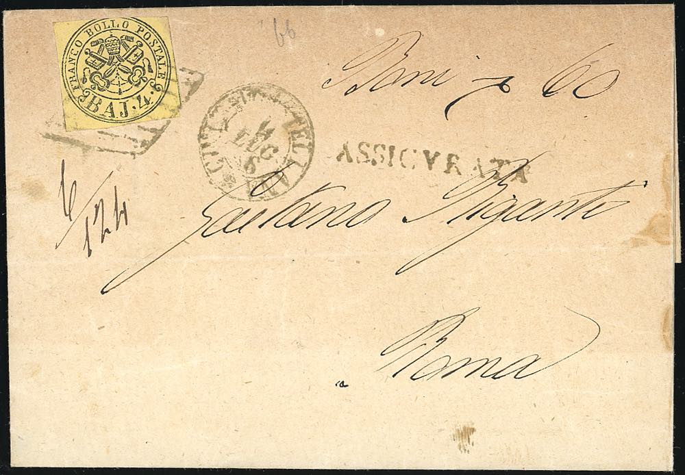 1866 - 4 baj giallo (5A), leggermente intaccato in alto, su sovracoperta di assicurata contenente "boni scudi 60" da Civita Castellana 4/7/1866 a Roma. Pregevole assicurata valore.