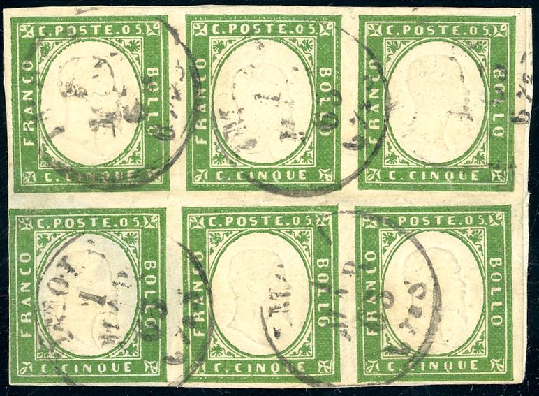 1863 - 5 cent. verde (13Ea), eccezionale blocco di sei, ottimo stato, usato a Imola 1/3/1863. Raro. Cert. Raybaudi (cat.Sassone € 15.000 in proporzione).