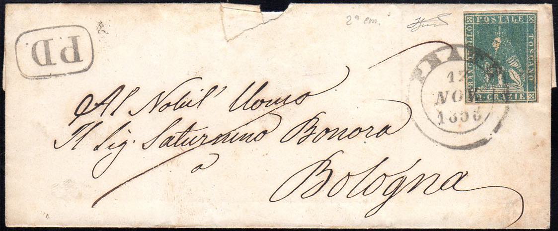 1858 - 2 crazie azzurro grigio verdastro, II emisisone (13a), perfetto, su sovracoperta di lettera da Prato 17/11/1858 a Bologna. Pregevole ... Read more