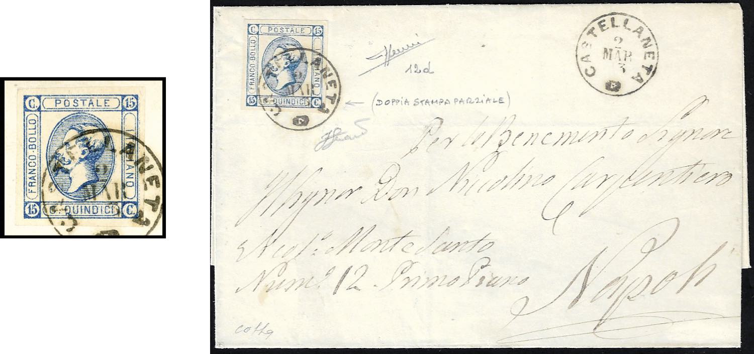 1863 - 15 cent. Litografico, I tipo, doppia stampa parziale in basso e a destra (12d), perfetto, su sovracoperta di lettera da Castellaneta 2/3/1863 a Napoli. Molto rara! Ferrario, cert. Colla e Sorani.