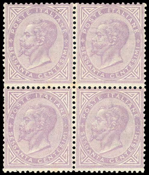 1863 - 60 cent. De La Rue, tiratura di Londra (L21), blocco di quattro perfetto, discreta/buona centratura, gomma originale integra. Bello e raro. Ferrario, cert. Fiecchi.