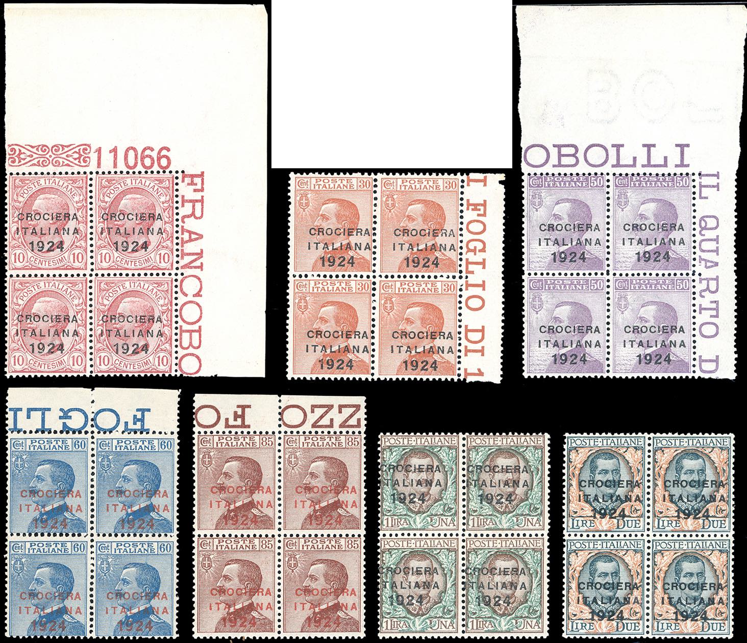 1924 - Crociera Italiana (162/168), blocchi di quattro, gomma integra, perfetti. Molto belli. G.Bolaffi per l'alto valore. Cert. Ferrario.