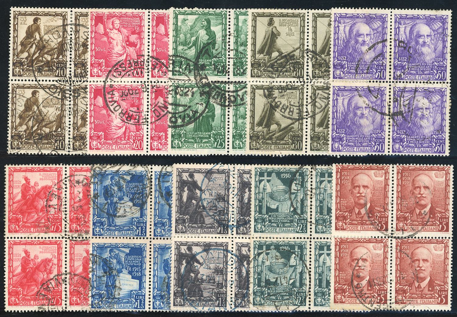 1938 - Impero (439/448), blocchi di quattro, l'1,75 lire in blocco di otto, usati, ottima qualità. Raro insieme.