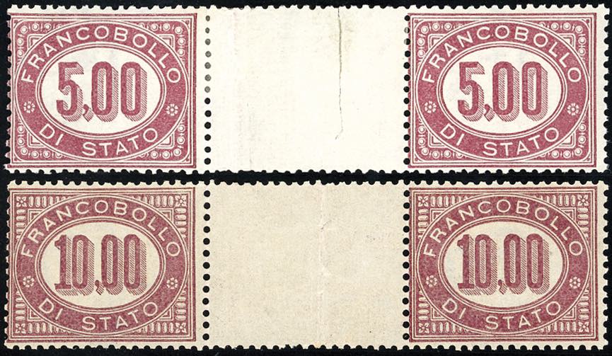 1875 - 5,00 e 10,00 lire francobolli di Servizio, coppie orizzontali con interspazio di gruppo (7,8), nuove, gomma originale, linguellata la coppia del 5 lire, integra quella del 10 lire, perfette. Rarissime e splendide! E.Diena, G.Bolaffi, cert. Ferrario.