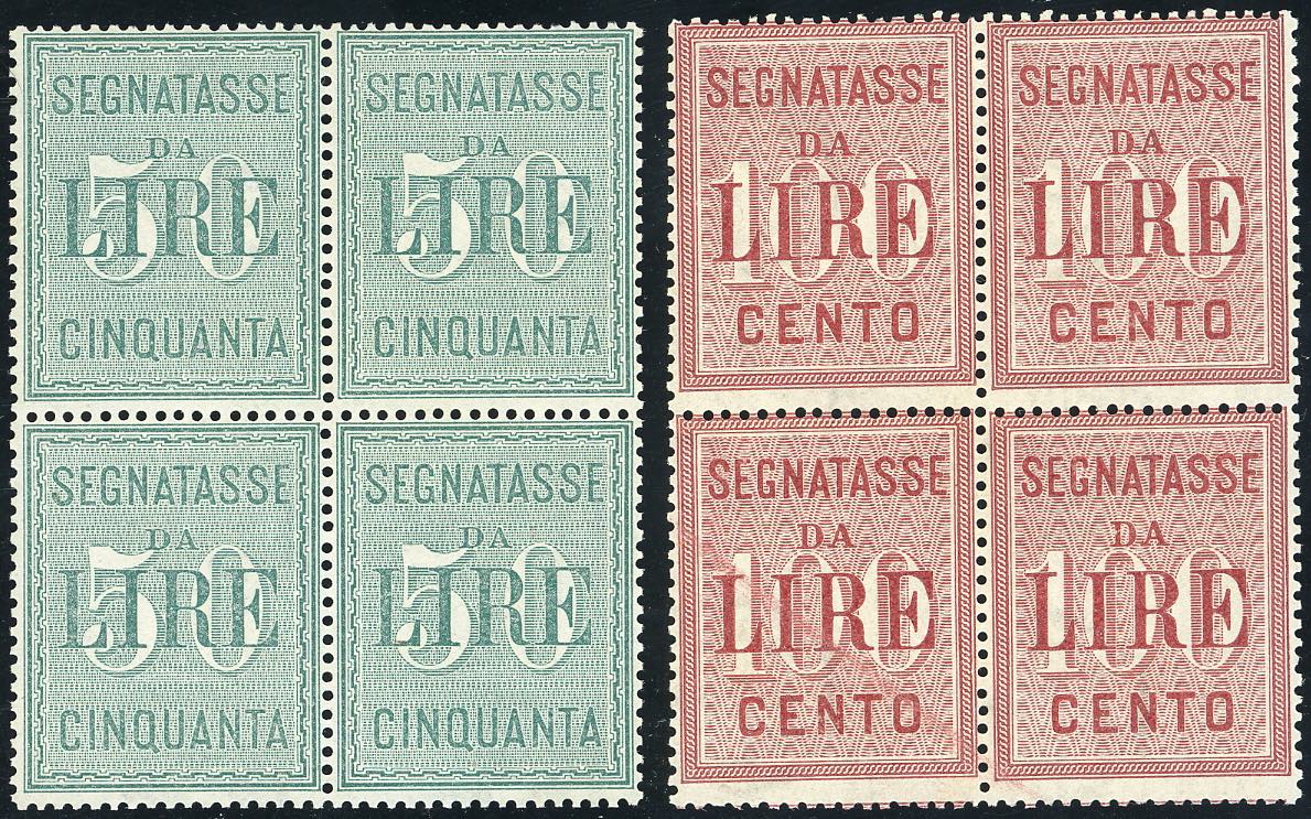 1884 - 50 e 100 lire (15/16), blocchi di quattro, gomma integra, perfetti. Ferrario.