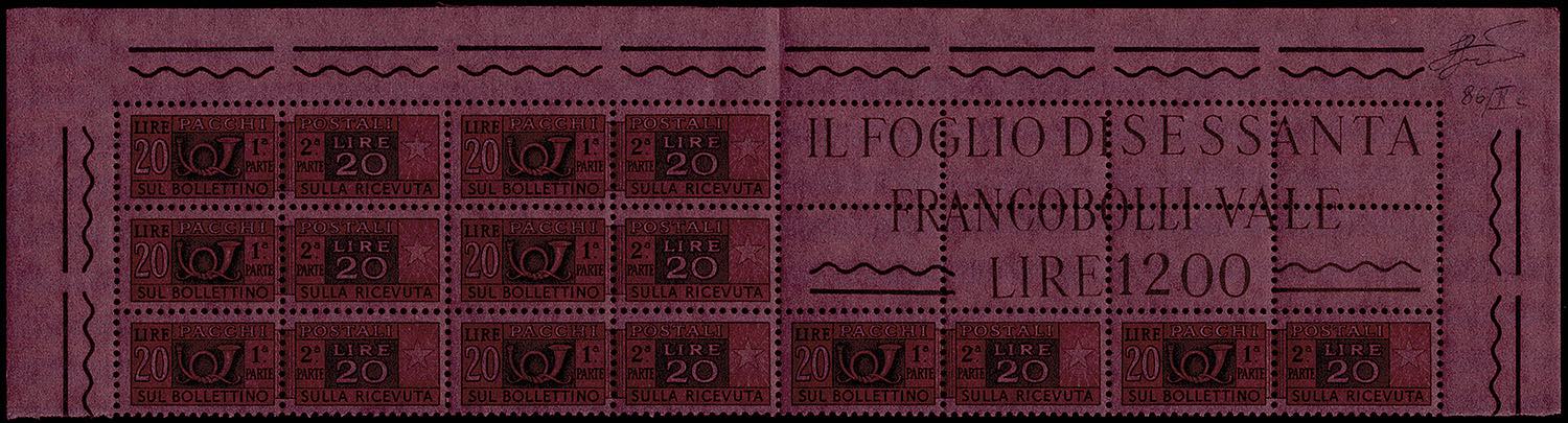 1955 - 20 lire, inchiostrazione anomala (86/IIs), testata del foglio con otto esemplari e blocco angolare, gomma originale integra, perfetti. D'effetto e raro! Ferrario.