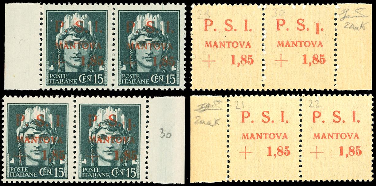 MANTOVA 1945 - 1,85 lire su 15 cent., soprastampa recto-verso, varietà "I" in basso, in coppia con il normale, due coppie, una con la ... Read more