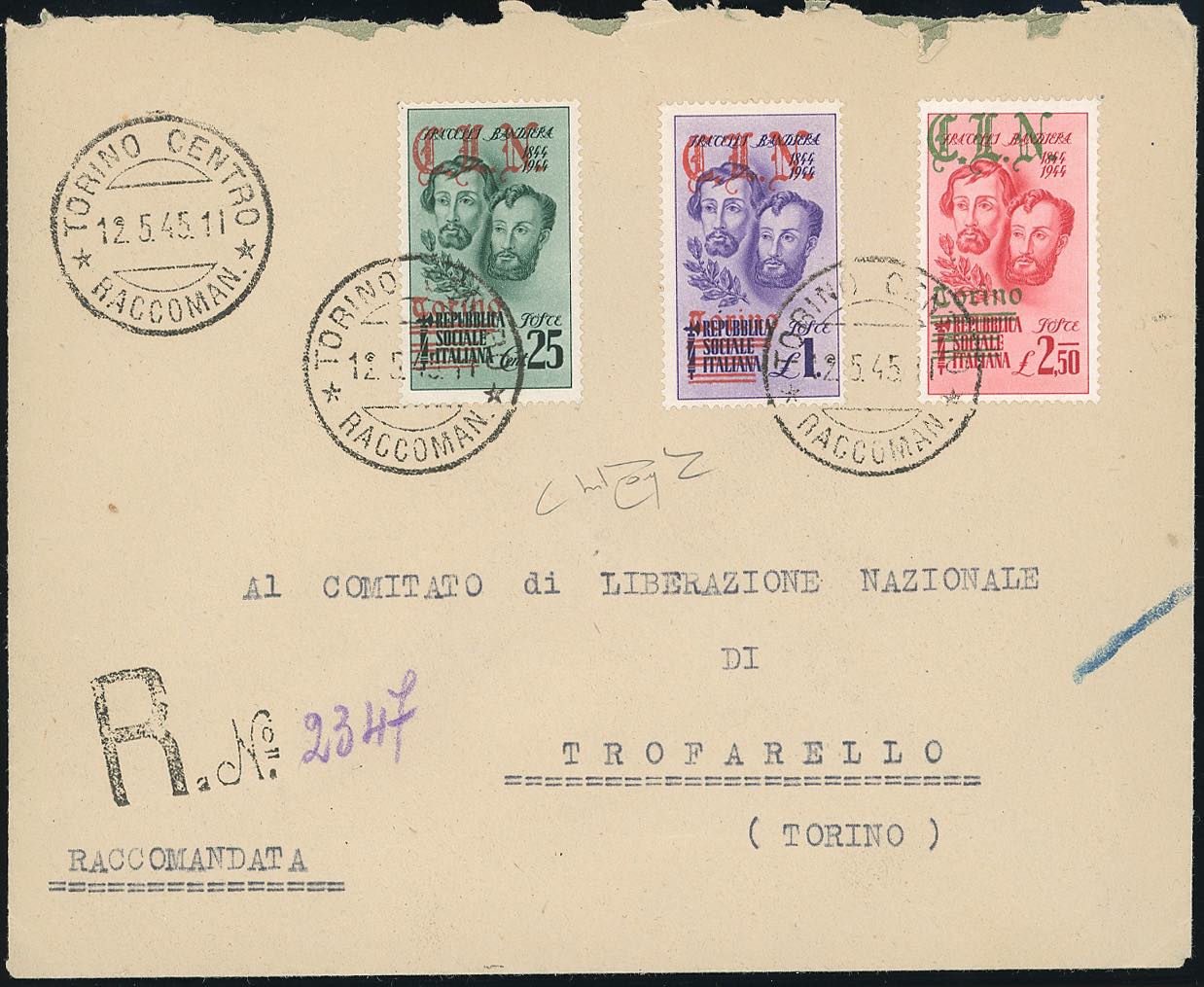 TORINO 1945 - Fratelli Bandiera soprastampati (Errani - Raybaudi 14/16), perfetti, su busta raccomandata da Torino 12/5/1945 a Trofarello, ... Read more
