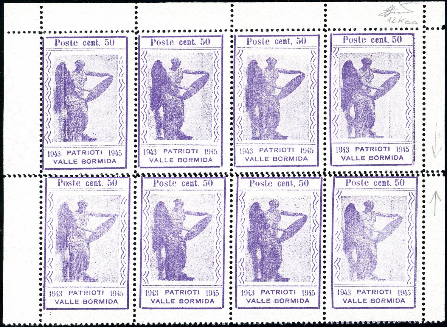 VALLE BORMIDA 1945 - 50 cent. violetto Perseo, blocco di otto esemplari formato da quattro coppie verticali su doppia dentellatura al centro (12Kaa), nuovo, senza gomma come sempre, perfetto. Splendido e raro insieme. Ferrario.