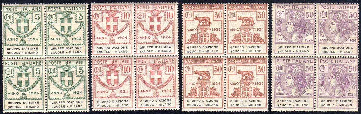 GRUPPO D'AZIONE SCUOLE-MILANO 1924 - Serie completa (38/41), blocchi di quattro, gomma integra, perfetti.