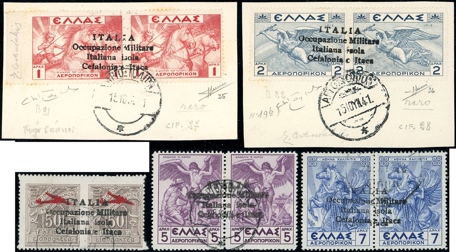 EMISSIONI DI ARGOSTOLI POSTA AERA 1941 - Esemplari in coppia soprastampati a mano, cinque valori (24/28), usati, perfetti. Raro insieme. Firmati Penco e/o Sorani, sette certificati Raybaudi e/o Chiavarello.