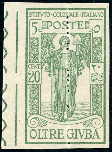 1926 - 20 + 5 cent. Pro Istituto Coloniale, prova d'archivio con dentellatura verticale al centro (P38 nota), bordo di foglio, senza gomma, ... Read more