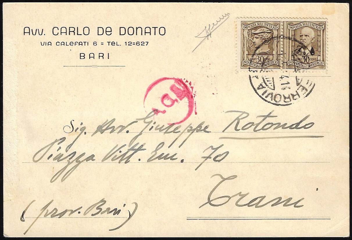 1944 - 30 cent. Imposta sull'Entrata, marca da bollo doppia, perfetta, su cartolina da Bari 14/5/1944 a Trani. Sorani.