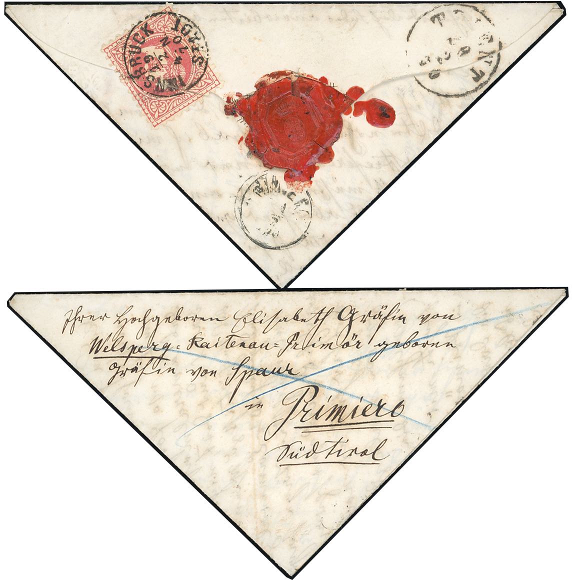 AUSTRIA 1870 - 5 kr. Francesco Giuseppe (34), lacerato all'apertura, al verso di lettera triangolare da Innsbruck 19/2/1870 a Primiero. Raro uso al verso contro il regolamento postale.