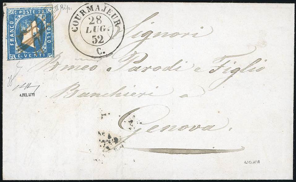 COURMAJEUR, tratti di penna e 2C, non catalogato - 20 cent. azzurro (2), due margini corti, su fresca lettera del 28/7/1852 per Genova. Si ... Read more
