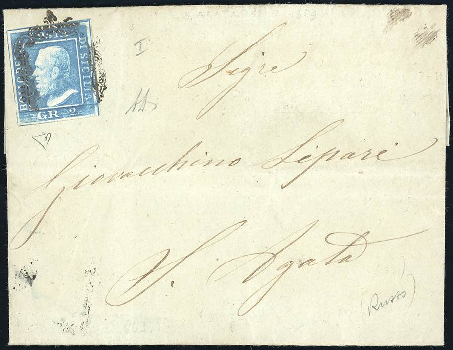 MESSINA, senza bollo nominativo, non catalogato - 2 grana (6), perfetto, su lettera del 15/9/1859 per S.Agata. Rara ed inedita! A. e ... Read more