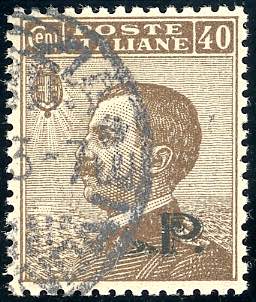 1922 - 40 cent., soprastampa nera BLP del II tipo, solo "P" in soprastampa (9Am) usato, perfetto. Si tratta probabilmente dell'unico esemplare usato noto di questa varietà. G.Bolaffi, A.Diena, cert. Raybaudi.