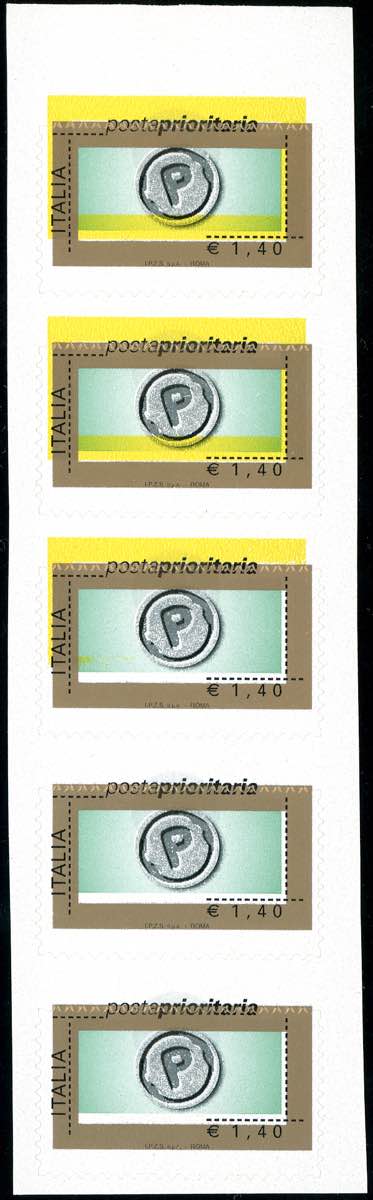 2007 - 1,40 € Prioritario (2932C), striscia verticale di cinque, fustellatura fortemente spostata, i primi tre esemplari con stampa del fondo giallo fortemente spostata in alto, nuova, perfetta. Rara. Ferrario.