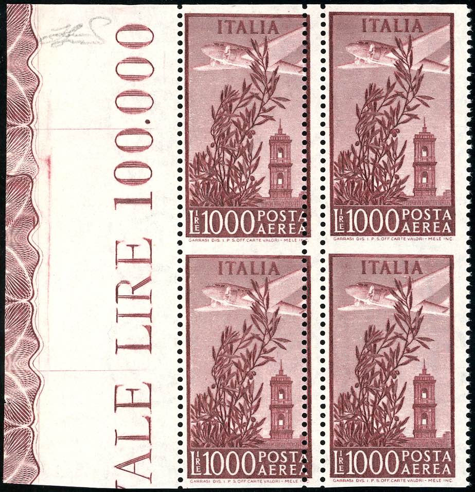 1948 - 1.000 lire Campidoglio, filigrana ruota, blocco di quattro, non dentellato orizzontalmente e con doppia dentellatura verticale al centro (Sass.spec.25Eb,25Ee), bordo di foglio, gomma integra, perfetto. Raro. Ferrario.