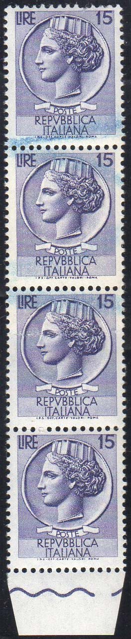 1960 - 15 lire Siracusana, filigrana stelle, striscia verticale di quattro, due esemplari stampati su carta ricongiunta (767/IIh), gomma integra, perfetta, leggeri segni di biffatura sul fronte. Chiavarello.