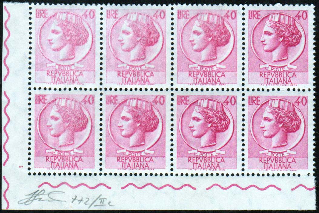 1955 - 40 lire Siracusana, filigrana stelle IV tipo, blocco di otto, cinque esemplari con stampa evanescente (772/IIc), angolo di foglio, gomma integra, perfetto.