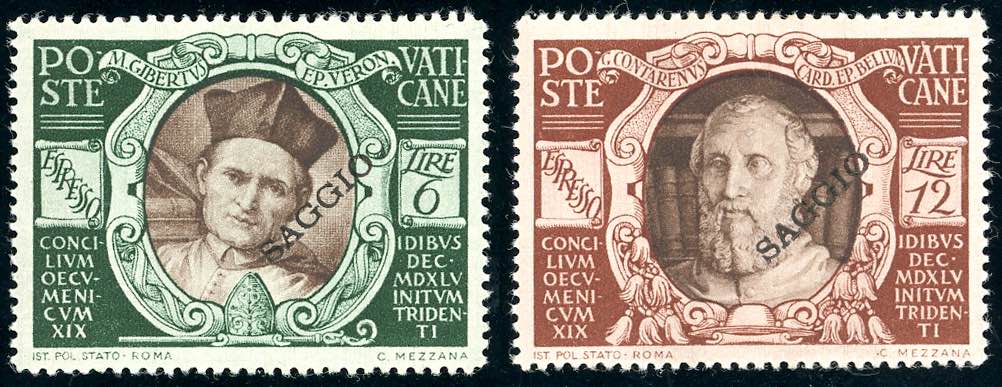 1946 - I due valori espressi del Concilio di Trento, soprastampati SAGGIO (E9/E10), gomma originale integra, perfetti. Ferrario.