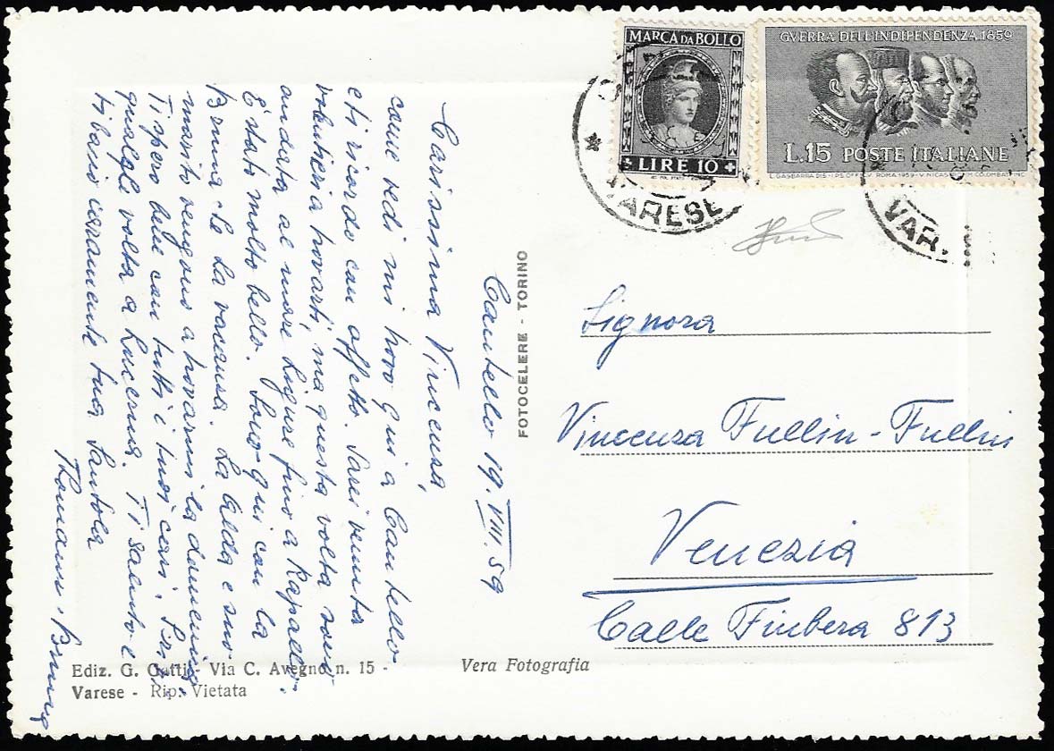 1959 - 15 lire II Guerra d'Indipendenza (866), in affrancatura mista con 10 lire marca da bollo, perfetti, su cartolina da Cantello 19/8/1959 a Venezia. Ferrario.