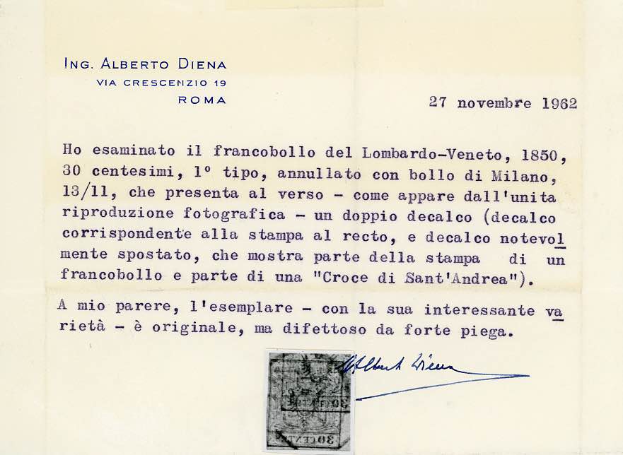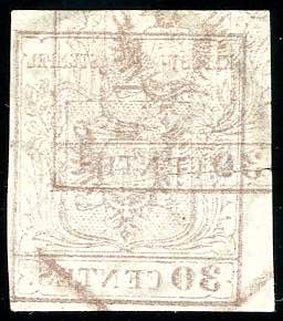 1850 - 30 cent. bruno, I tipo (7), doppio decalco, uno corrispondente alla stampa del francobollo, l'altro spostato e mostrante parte di una Croce di Sant'Andrea, usato a Milano, difettoso. Estremamente raro. Cert. A.Diena.